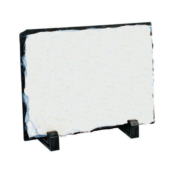 Schiefertafel mit weiß matter Oberfläche. Es handelt sich um handgefertigten, bearbeiteten Schiefer. Daher ist jedes Stück ein Unikat. Mit abgeschrägten Kanten und inklusive Aufsteller.